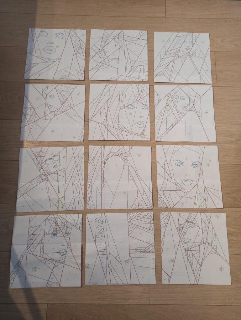 This pattern was drafted as 12 blocks, so when you’ve taped the full pattern, cut it into the 12 blocks. I recommend working on them one by one due to the color marks, also due to different difficulty levels. The bottom text is optional to include, if you’re keeping it, cut this off but keep intact for placement later on.